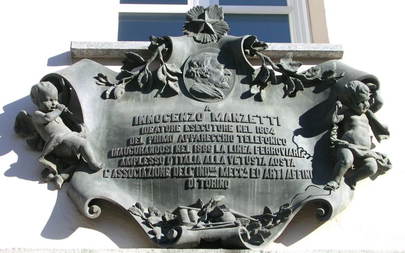 Targa dedicata ad Innocenzo Manzetti ideatore esecutore nel 1864 del primo apparecchio telefonico – Foto di Gian Mario Navillod.